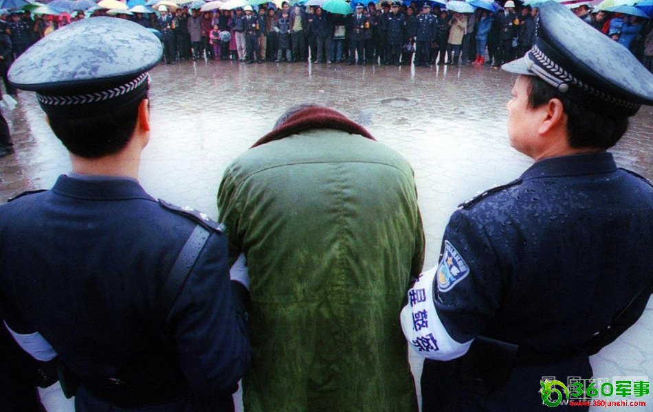 2004年1月15日,武汉铁路警方在汉口火车东站召开公开处理大会。图为被公开处理的票贩子低下了头。
