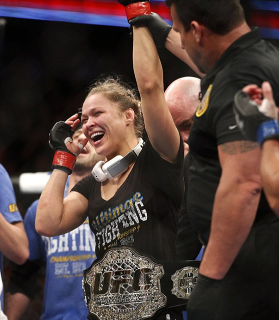 此次终极格斗冠军赛于美国加利福尼亚举行,在羽量级格斗赛中,前柔道冠军鲁西在第一回合利用其标志性战术——肘关节锁定术将卡尔穆什的手臂足足控制11秒钟,她那看似让人无法动弹的战术迫使卡尔穆什投降,从而赢得比赛。