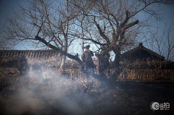 2月2日,朝鲜将军府前,几个朝鲜人民在烧火。这里是朝鲜相对有权力的军官住的地方,一座座矮房子,装饰得很简洁。