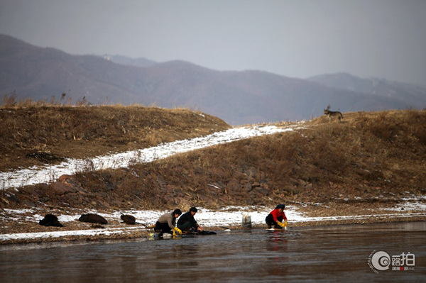 2月12日,边境线上洗衣服的朝鲜妇女。