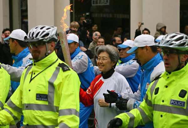 2008年4月6日,伦敦,在当地警方的护卫下,中国驻英大使傅莹完成了约200米的火炬传递。