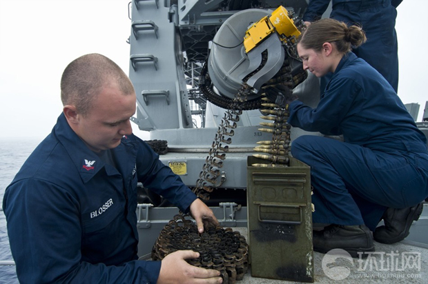 美国海军士兵给同属于艾森豪威尔号航母编队的USS Hue City号巡洋舰上的近防武器填装弹药。
