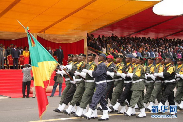 8月15日,在刚果(布)普尔省省会金卡拉,刚果(布)总统萨苏(右二)检阅部队